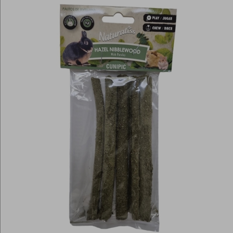 Las Maderitas de Avellano con Perejil Naturaliss son 5 snacks en forma barritas masticables ideales para complementar la dieta de tu pequeño animal. Este delicioso snack es elaborado con avellana y cubiertas de zanahoria. Además de ser ideal para roer también puede ser el perfecto aliado para el entrenamiento, así como el complemento perfecto para su dieta. Los snacks Naturaliss están hechos a mano en cada paso.