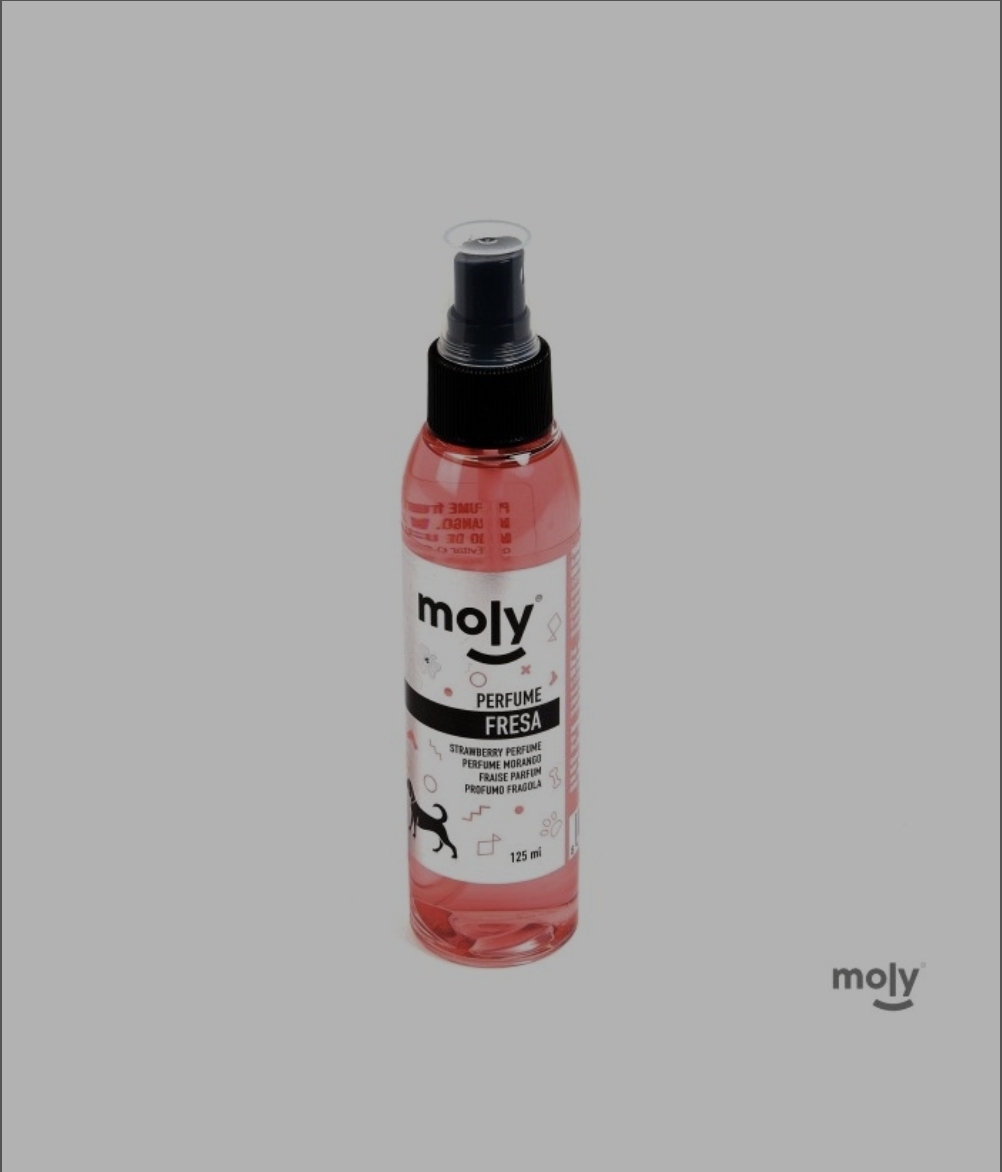 Perfume para perros con agradable aroma a fresa. Los perfumes y colonias de Moly son naturales e hipoalergénicos, no irritan ni resecan la piel. El aroma frutal es apto para todos los perros: hembras, machos, cachorros.
